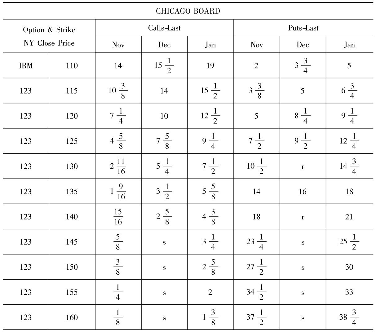 说明: 第一栏为IBM在NYSE收盘股价; 第二栏为执行价格,第三、四、五栏分别为11月、12月、1月到期的看涨期权收盘价; 第六、七、八栏分别为11月、12月、1月到期的看跌期权收盘价。s表示没有这个合约,r表示今天没有交易量。