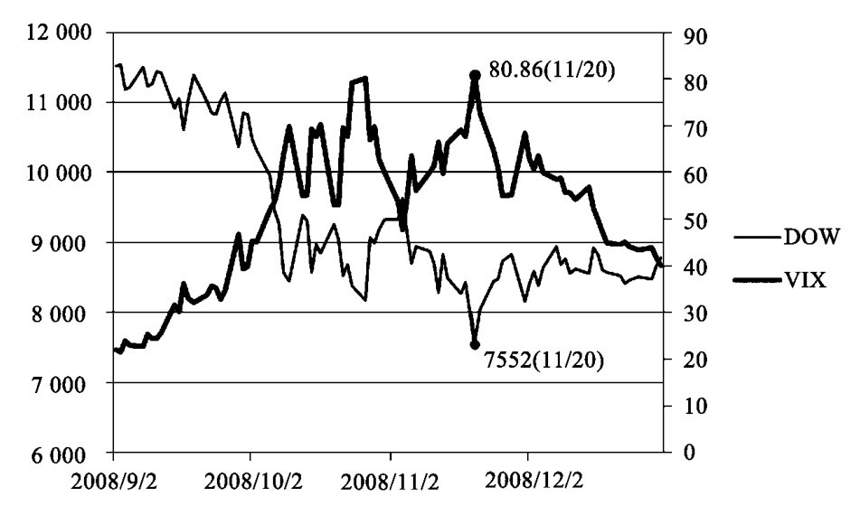 图6-21中,细线体代表道琼斯指数,而粗线则为VIX。由图中可以看出,在9月初时,道琼斯股价指数还在11500点附近,VIX约为22。9月中,随着道琼斯股价指数下挫,VIX逐渐上升,10月,道琼斯股价指数跌破万点,VIX已经来到50附近。10月27日,当道琼斯股价指数下跌到8175点时,VIX冲到80.06。VIX最高点则出现在11月20日的80.86,当天道琼斯股价指数下跌了445点(约5%),收在此波段的低点7552。之后,道琼斯股价指数逐渐回稳,而VIX也逐渐下降。到了12月底,VIX已经回到40附近的水平。