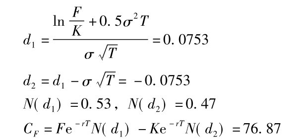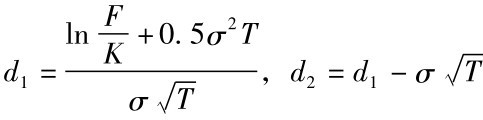 其中:CF为期货期权价格,,F为期货目前的价格, T为到期期限,K为履约价值,σ为期货的波动率,r为无风险利率,N(d1)为标准常态累积概率函数。