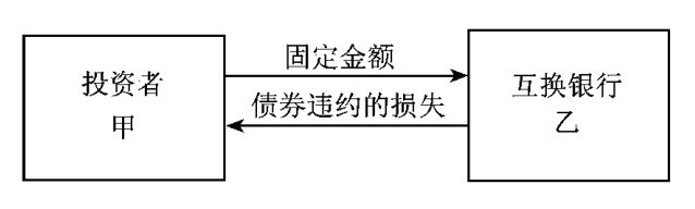 信用违约互换(CDS),是用来规避由于对手信用违约所导致的损失的风险。信用违约互换简单的含义是指承受信用风险的甲方支付一笔固定的费用给乙方,而乙方承诺当甲方因第三者信用违约发生损失的时候,乙方将甲方所承受的损失支付给甲方。譬如投资者甲拥有A公司的公司债,但是怕公司债违约造成损失,因此甲方可以跟互换银行订立一个5年期的信用违约互换。如图13-8,甲方每3个月付给互换银行权利金,而互换银行保证在5年内如果A公司的公司债发生信用违约,互换银行将支付面值与债券违约后最终价格的差额给甲方。