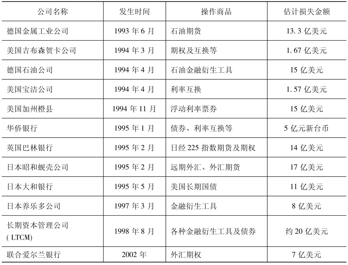 在此将近年来发生在全球各地的金融衍生工具操作失利的案子汇总于表14-1。