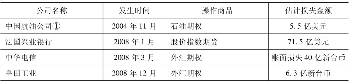 过去十多年来全球发生操作金融衍生工具失利的案例层出不穷,本节将介绍一些比较有名的案例。首先,介绍操作期权失利的事件,包括“中华电信”[1]及皇田工业等,接着再介绍操作其他金融衍生工具失利的事件,最后介绍2008年全球金融海啸。