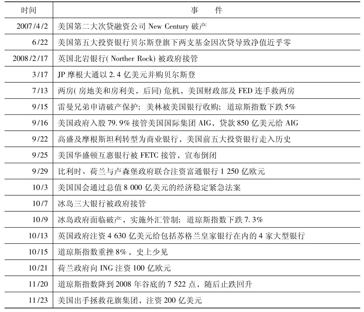 2008年9月15日,雷曼兄弟公司宣告破产,同日美林证券被美国银行以500亿美元并购,引爆了全球金融海啸。兹将2008年全球金融海啸重要事件时间,整理列于表14-4。