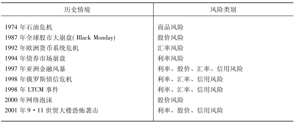 历史情境分析是讨论假如在某历史事件重演时,对公司VAR的影响。譬如对股市而言,如果像1987年10月19日的黑色星期一、全球股市崩盘的情况再度发生,那么公司的VAR将会如何? 对汇市而言,如果类似1994年12月20日墨西哥比索大贬,或1998年8月东南亚金融风暴、亚洲各国汇率大贬这些情况再度发生,公司的VAR将会如何? 对利率风险而言,如果类似1994年2月4日,美国联邦储备银行(Fed)突然改变政策,连续调高利率而使债券市场崩盘的情形再次出现,那么公司的VAR又将如何?这些都是历史情境分析的例子,也都是历史上曾发生过的重大事件,对VAR将有非常重大的影响。兹列出各国银行常用到的历史情境分析,如表16-2。