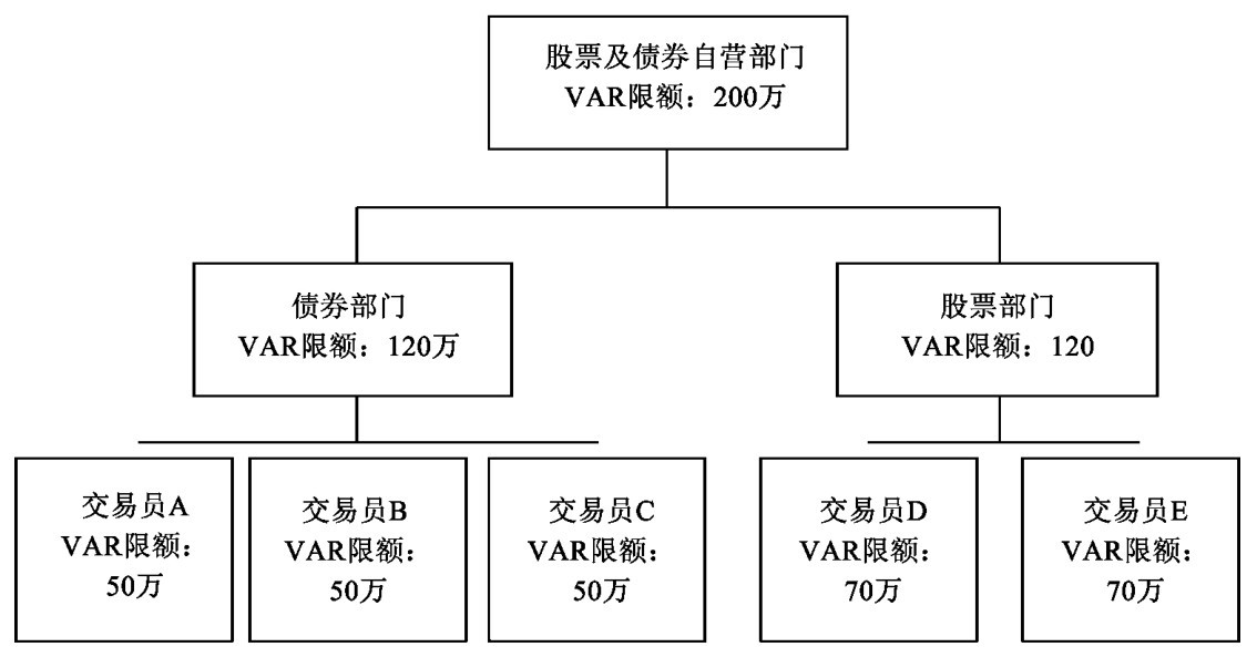 如图16-2,假设有一个股票及债券自营部门,分配到200万元部位的VAR限额。那么主管便可以将这200万元限额分配给下面的股票部门及债券部门各120万元。由于两部门的相关性产生分散效果,使两部门VAR加总等于200万元。另外,债券部门的主管把这120万元VAR限额分配给该部门的三位交易员,譬如每个人50万元VAR限额; 而股票部门每人70万元VAR限额,由于VAR有分散效用,所以部门VAR的值会小于个人VAR值的加总。这样经由VAR由上而下的分配,便可以有效控制及分散风险。