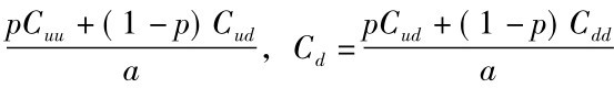 看涨期权两期模型公式18-2 可以由公式18-1 单期推导出来。由于Cu=,将Cu、Cd代入公式18-1,即可得到公式18-2,此部分留于本章习题。另外也可以由Cuu、Cud、Cdd往前推而得到Cu、Cd; 然后由Cu、Cd再推出C。