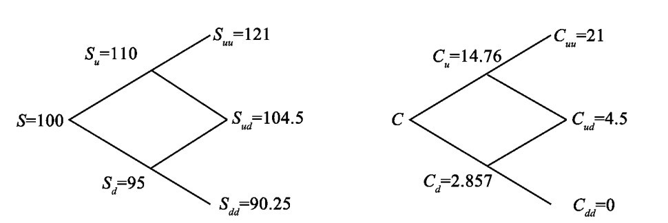 【例题2】 假设目前股价S=100,看涨期权执行价格K=100,还有1年到期,每半年股价变动一次,另假设u=1.1,d=0.95,年利率为10%,求此欧式看涨期权的价格。