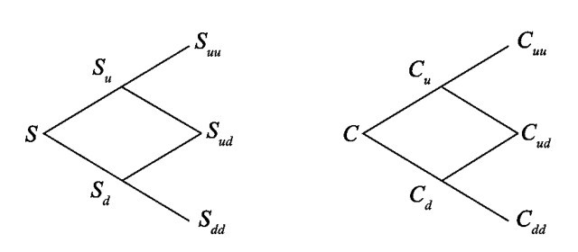假设股价在期权到期前有两次上涨或下跌的机会,如图18-2所示。股价在第二期有上涨2次的Suu,上涨一次及下跌一次的Sud及下跌二次的Sdd,其对应的看涨期权价值分别为Cuu、Cud及Cdd。