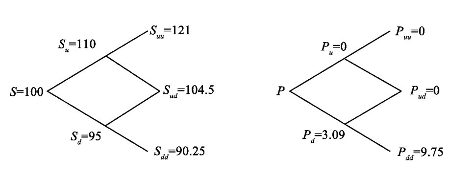 【例题3】 假设S=100,u=1.1,d=0.95,a=1.05,n=2,求执行价格为100元的欧式看跌期权及美式看跌期权的价格。