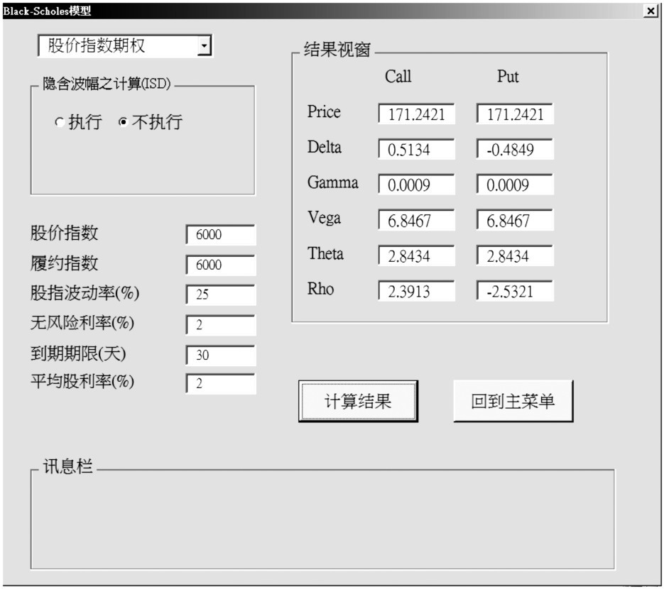 Black-Scholes评价模型共分成认购(售)权证评价、股票期权评价、股价指数期权、外汇期权与期货期权等5部分。其中,在认购(售)权证及股票期权的部分为了符合我国台湾地区目前认购权证市场除权时比例会进行调整的特性,本评价软件允许用户调整执行比例。