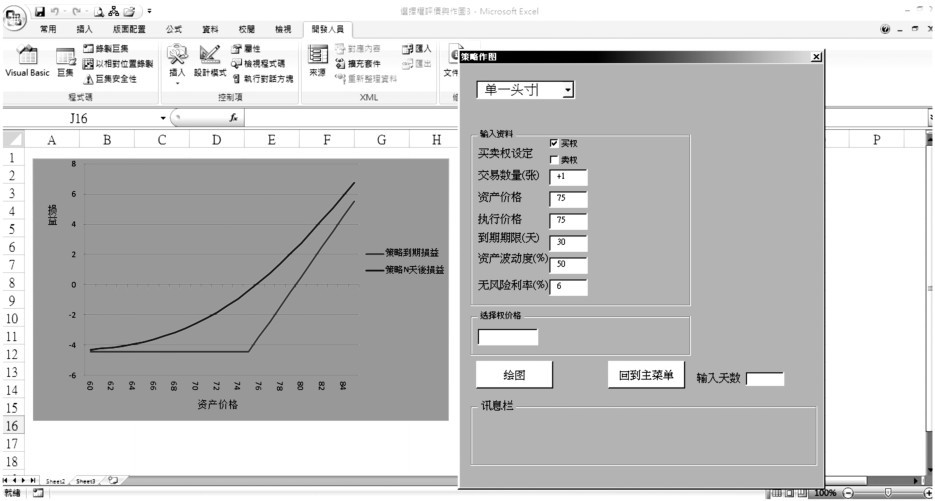 此部分给使用者提供各种策略到期损益图形,计算原理是采用Black-Scholes评价模型。在交易数量上,正号代表买入,负号代表卖出。其中,期权价格为理论价格,若用户要以市价为准,可先利用本软件计算隐含波幅,再代入变量即可。此外,使用者还需输入天数,再执行绘图时即可看到未到期前的损益线图。
