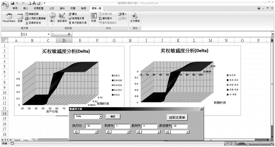 敏感度分析图形可以让用户了解不同价内外程度及不同到期日下的Delta、Gamma、Vega、Theta及Rho,使用者只要在输入框输入变量并点选确定按钮就可以看到各种图形。