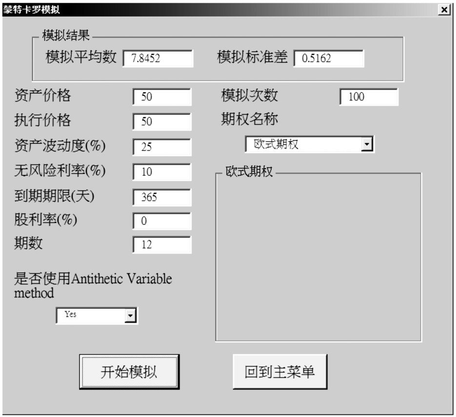 本版共可进行4种欧式买权的模拟,分别是欧式期权、算数平均式期权、几何平均式期权以及界限期权。但使用者必须知道,蒙特卡罗仿真本身就有速度上的限制,因此模拟结果的产生会相对耗时,故在此建议使用者不要输入太大的仿真次数,否则计算机所须耗费的时间也会相当可观。此外,本程序内定每次均模拟5次,而每次模拟的次数为使用者所输入的次数,因此,总模拟次数为使用者所输入的次数乘以5,这5次模拟的结果,就产生模拟平均值与标准偏差的输出。若绿色字字段为空白,则以最小值来处理。但算术平均式及几何平均式期权中的自定义期数字段若为空白,则以所有股价平均为准,而自定义期数的字段中,各期数间以点“.”作为间隔,举例来说1年分为四期,以第二期与第四期股价作为平均,则在自定义期数栏中打入2.4,否则若为空白则会以第一、二、三、四期股价作为平均。在界限期权中,若对应出局模式的出局金额字段若为空白,则视同一般期权处理,但其中上下出局的字段所对应的出局金额则不可空白,否则可能会有错误的结果输出。