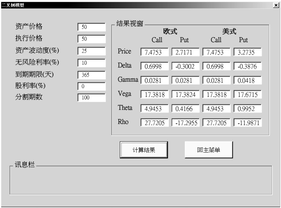 二叉树评价模型可用来计算欧式买卖权、美式买卖权的价格,以及相关的避险比率。针对绿色字的字段若为空白,则同样视为0来处理。此外,使用者在输入期数时最好不要超过1000期,否则计算速度会较慢。