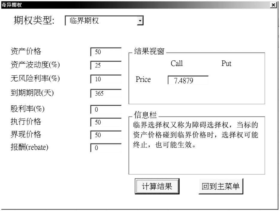 本版共可计算9种欧式的奇异期权,其详细的内容请参阅前面第十七章的说明。其中,绿色字的部分若为空白,则会出现提示错误的信息并等待用户重新输入。