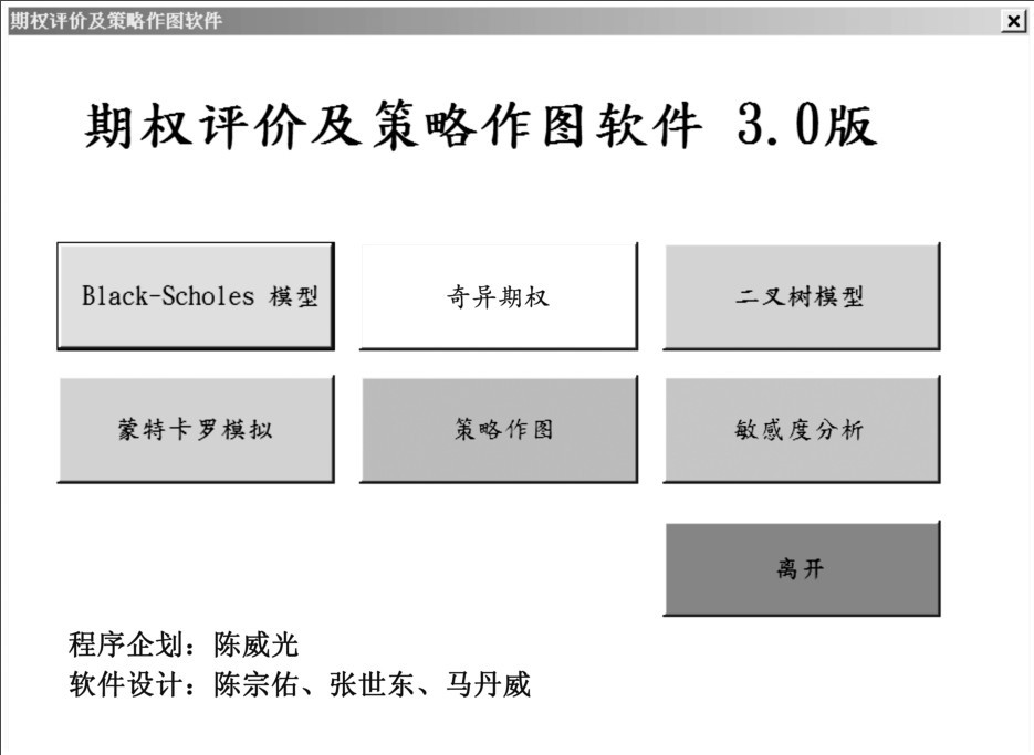 本软件共分成Black-Scholes评价模型、奇异期权、二叉树模型、蒙特卡罗模拟、策略作图及敏感度分析等6大部分。各个模型中都有其适用的范围及限制,请参阅书中的说明。以下则针对本程序使用上的共通规则及特殊规则作一说明。
