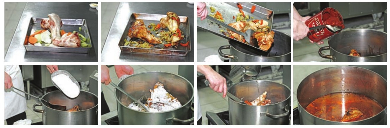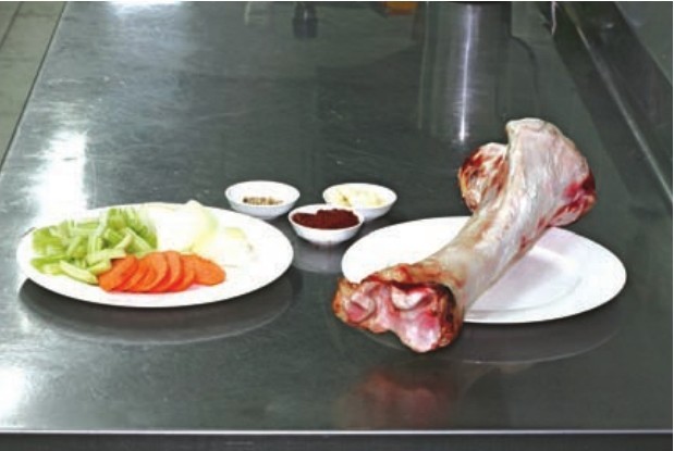 材料牛骨1.5千克,番茄膏30毫升,洋葱100克,胡萝卜(粗切)150克,大蒜(粗切)80克,西芹(粗切) 100克,胡椒粒8粒。