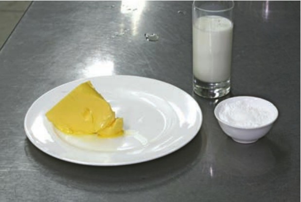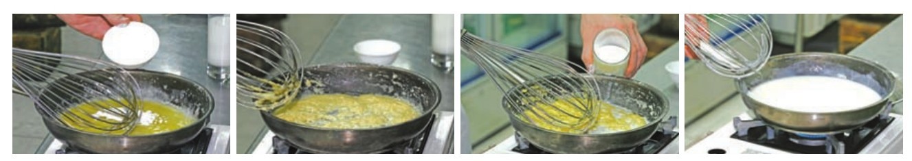 1 把面粉加进溶化的牛油中,以小火烹煮。