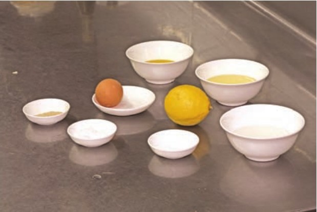 材料蛋黄1个,橄榄油、玉米油各150毫升,白醋10毫升,盐、胡椒粉各少许,糖10克,柠檬1个。