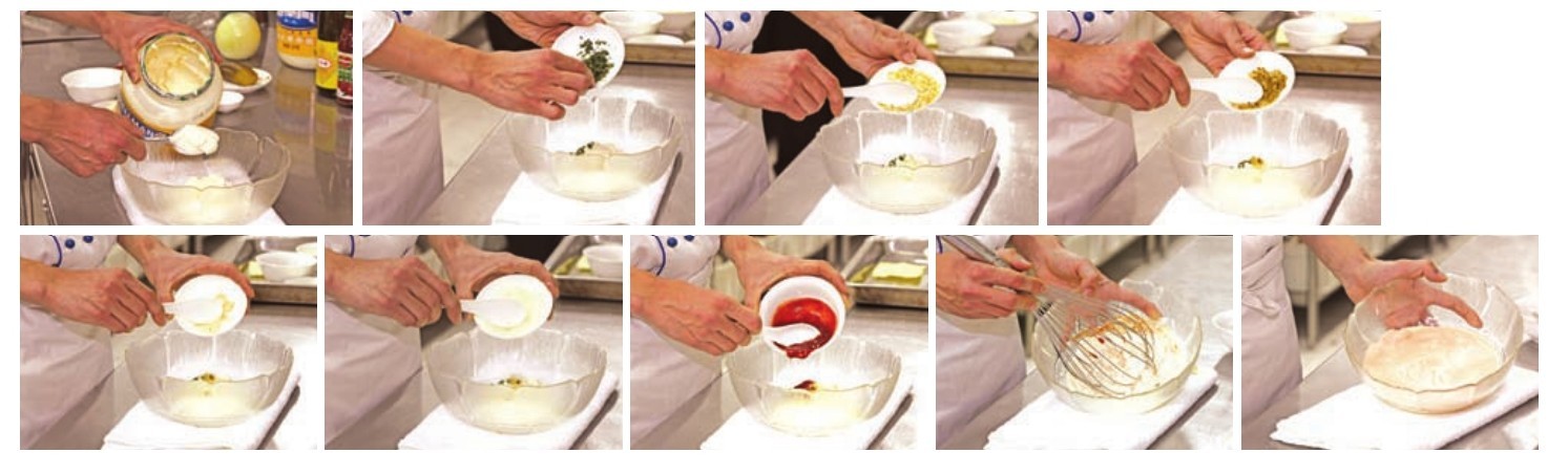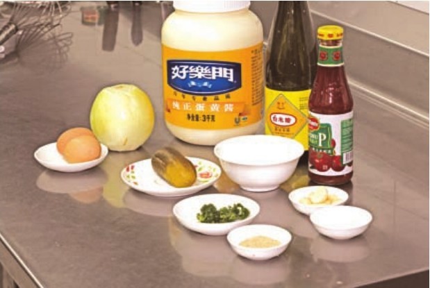 材料蛋黄酱500克,西红柿沙司150克,酸黄瓜180克,熟鸡蛋200克,法香20克,洋葱、蒜蓉各10克,白醋10毫升,糖15克,精盐、胡椒粉各少许。