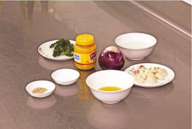 材料洋葱碎20克,醋30毫升,橄榄油90毫升,法国芥末酱10毫升,法香碎、蒜蓉各10克,盐、胡椒粉各少许。