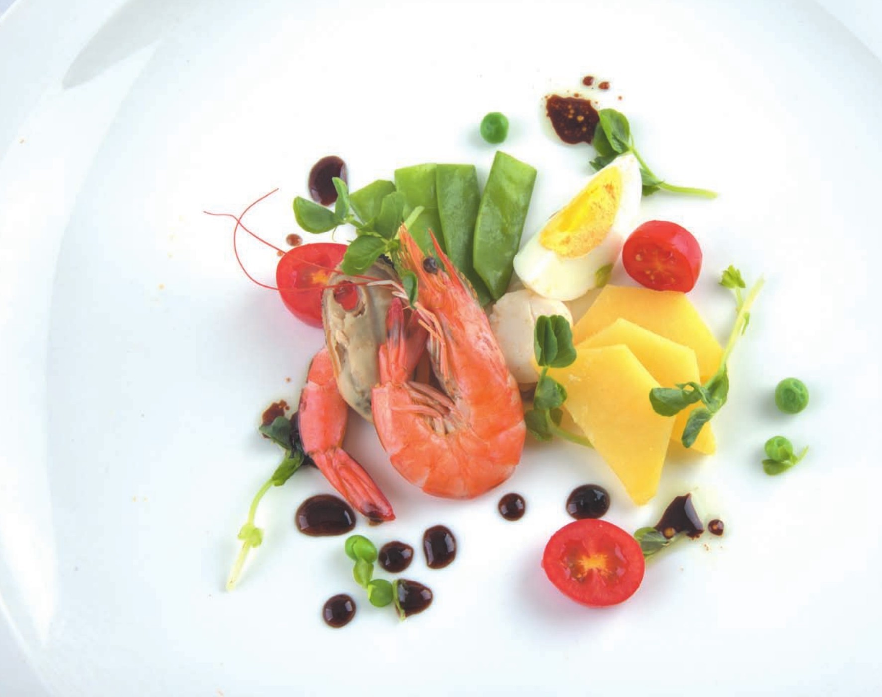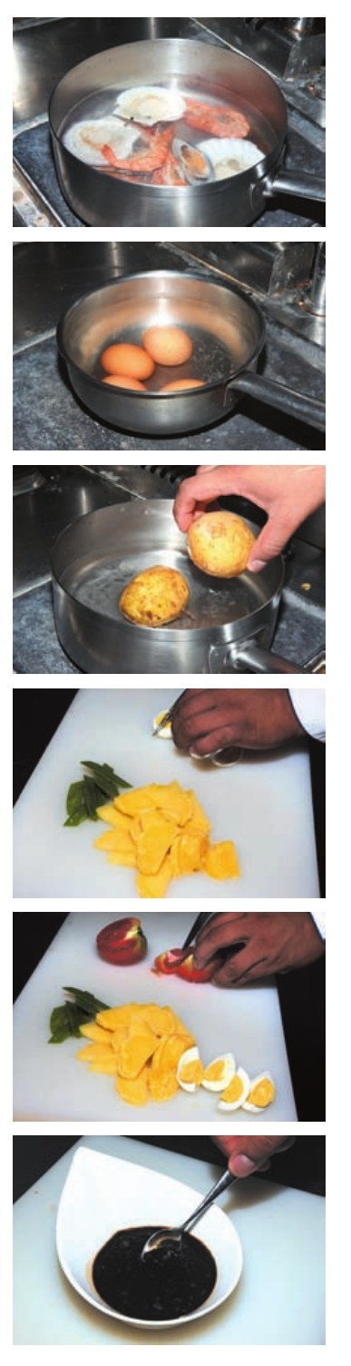 材料 青虾、扇贝、青口贝各3只,土豆、鸡蛋、番茄各1个,荷兰豆40克,意大利黑醋、橄榄油各20毫升,香葱10克,百里香适量。