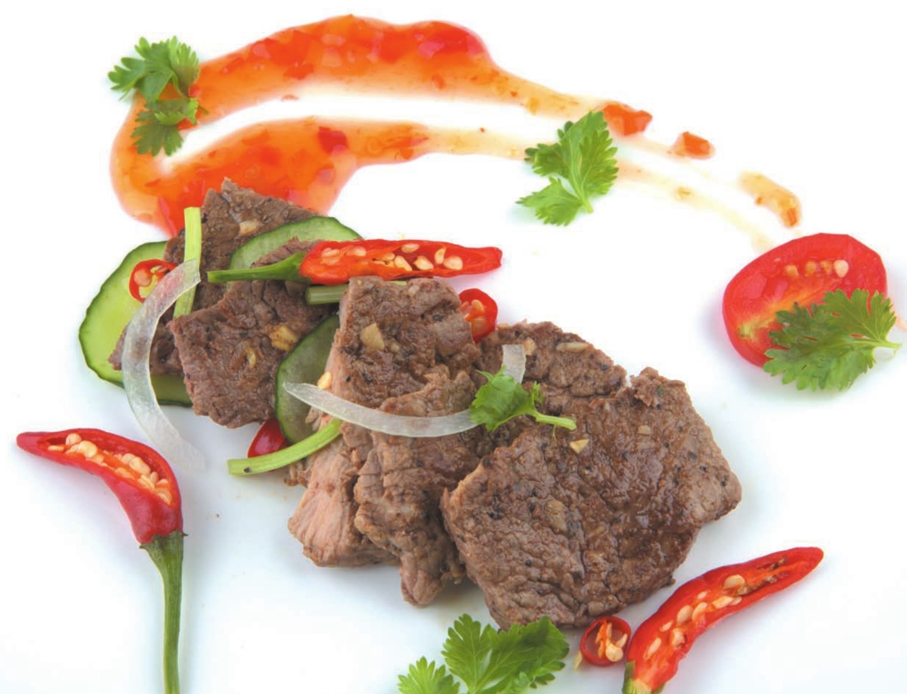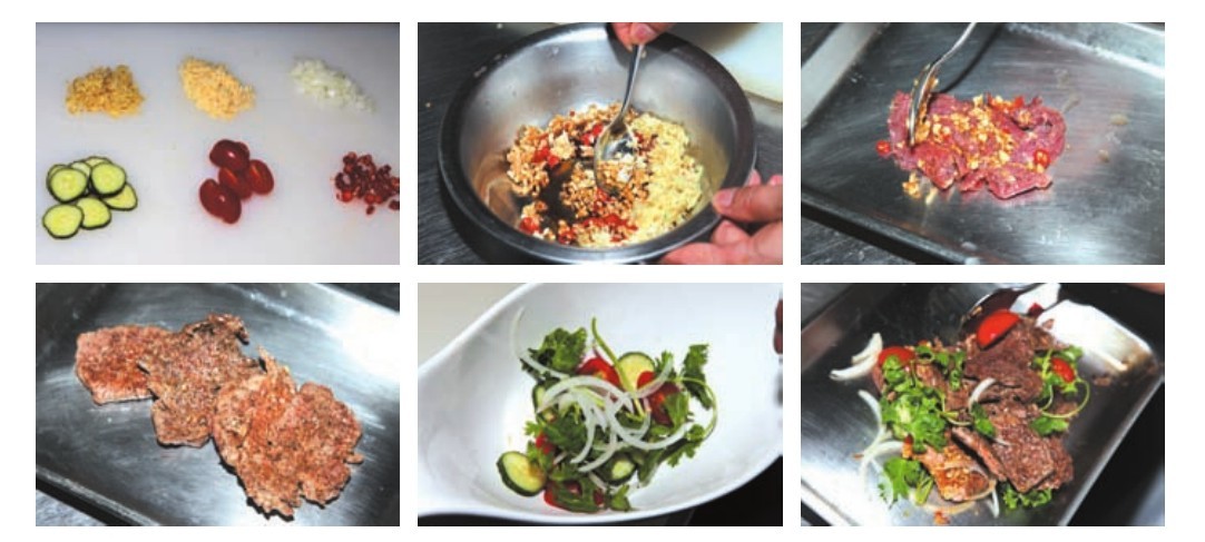 材料 牛柳500克,红洋葱1/2个,黄瓜40克,樱桃番茄20克,紫苏叶3片,香菜20克,罗勒叶3片,姜、蒜各10克,小米辣5克,烤花生适量,青柠汁、芝麻油各15毫升,鱼露10毫升,酱油10克,黄糖5克。