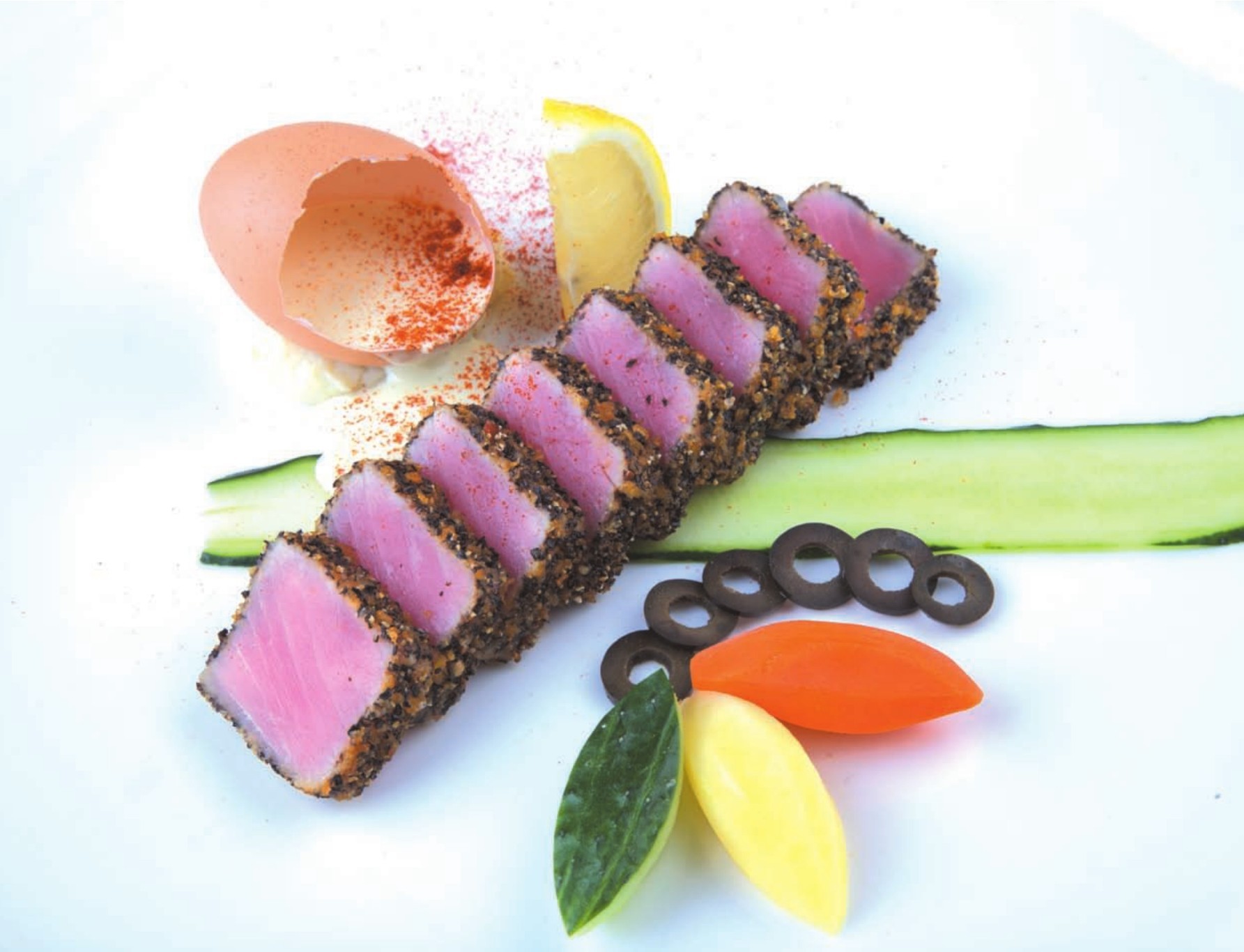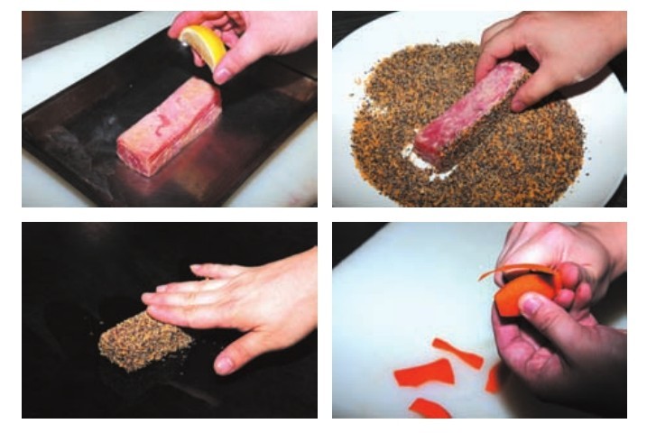2 Coat black peppercorn and breadcrbs on the pickled tunas.
