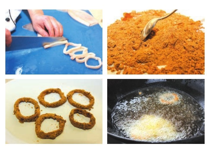 3 Dredge the squid with flour, wrapped egg liquid, then coat with mixing powder.