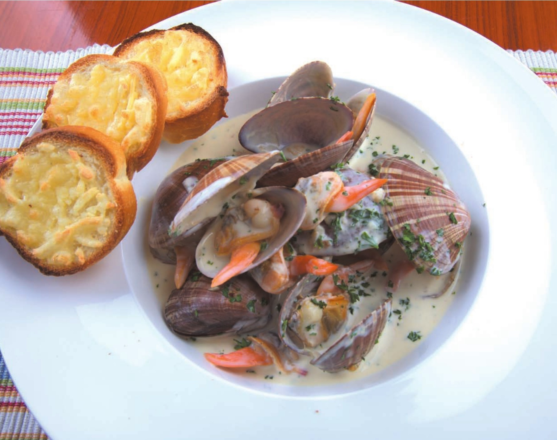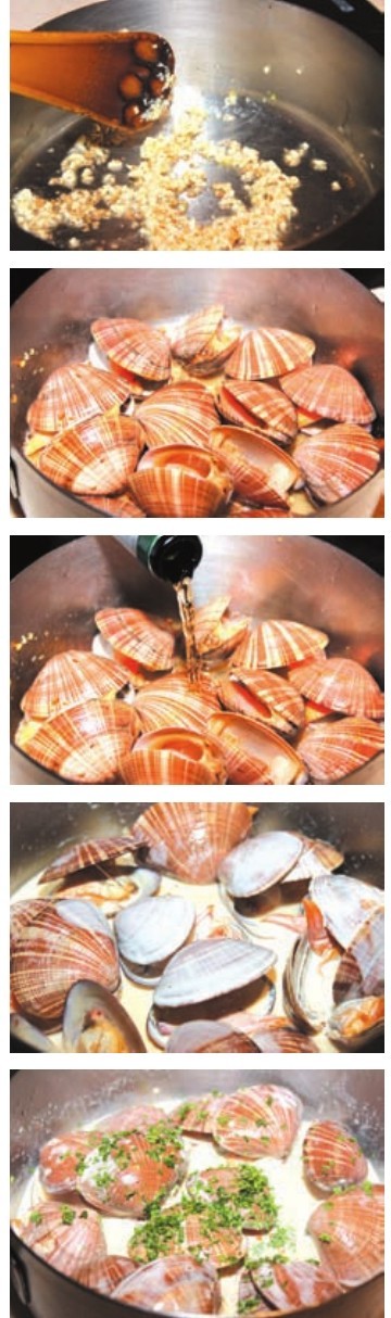 材料 大文蛤500克,蒜蓉25克,鲜法香碎5克,白葡萄酒25毫升,淡奶油35克,橄榄油20克。