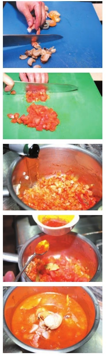 2 锅中加油烧热,炒香各种蔬菜,再加入白葡萄酒、藏红花和海鲜汤底烧沸。