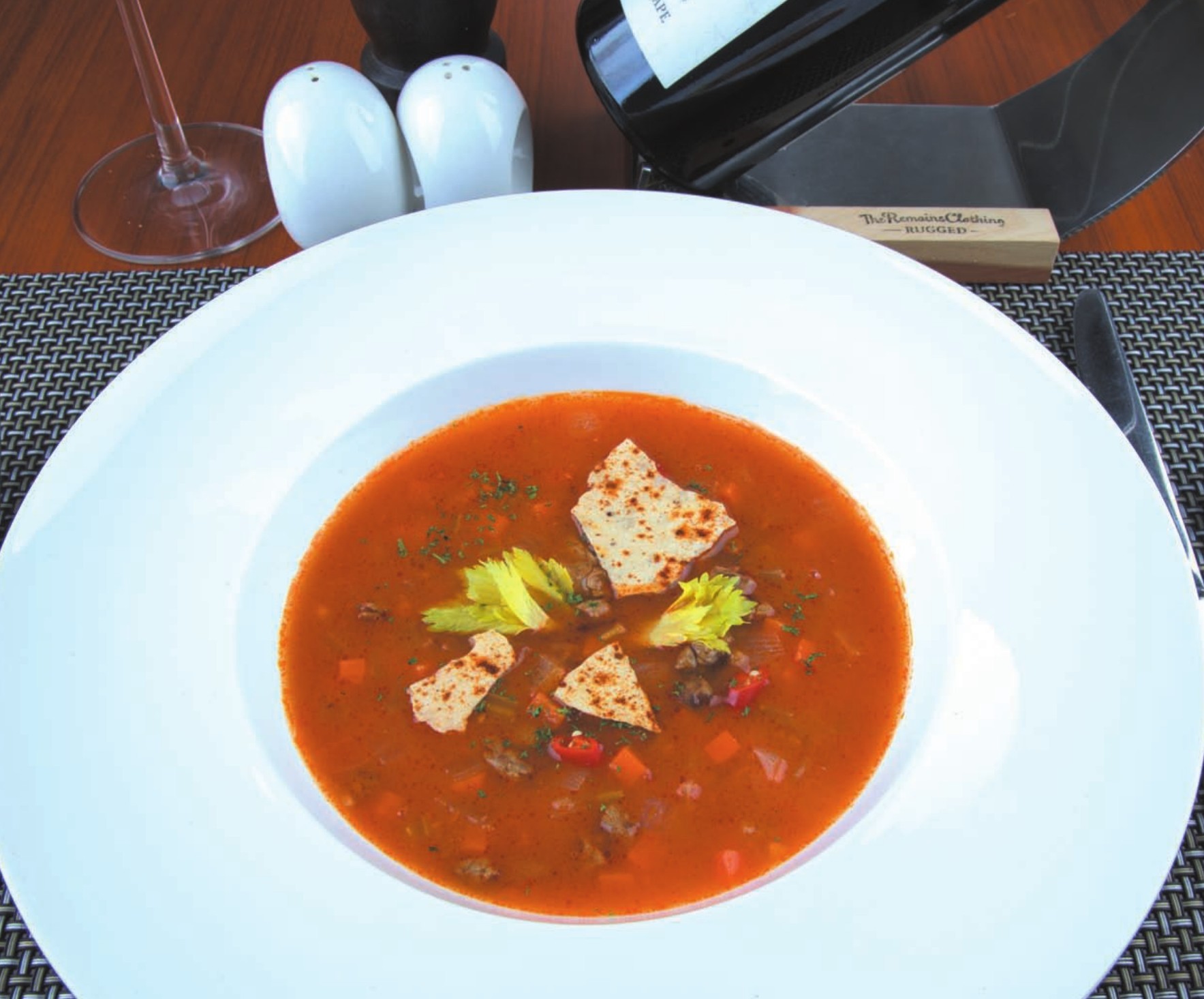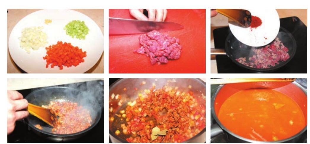 材料 牛柳250克,洋葱45克,胡萝卜、西芹各30克,蒜末10克,土豆100克,番茄膏20克,红酒30毫升,香草3克,面粉、盐、胡椒粉各少许,甜辣椒粉5克,牛肉汤底适量。