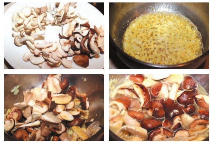 1 Clean up all kinds of mushrooms, slice up them. Cut onion into shreds.