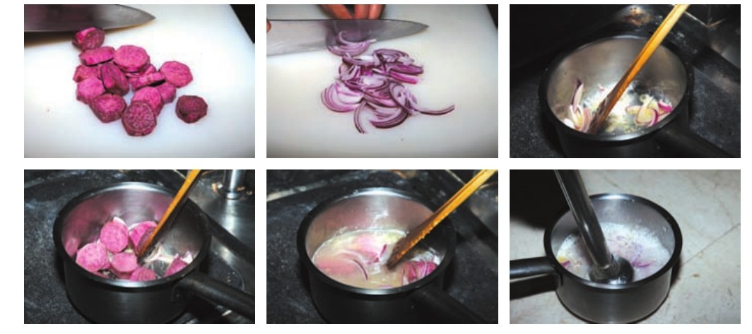 4 加入鸡汤底煮至紫薯软烂,用打碎机打碎。