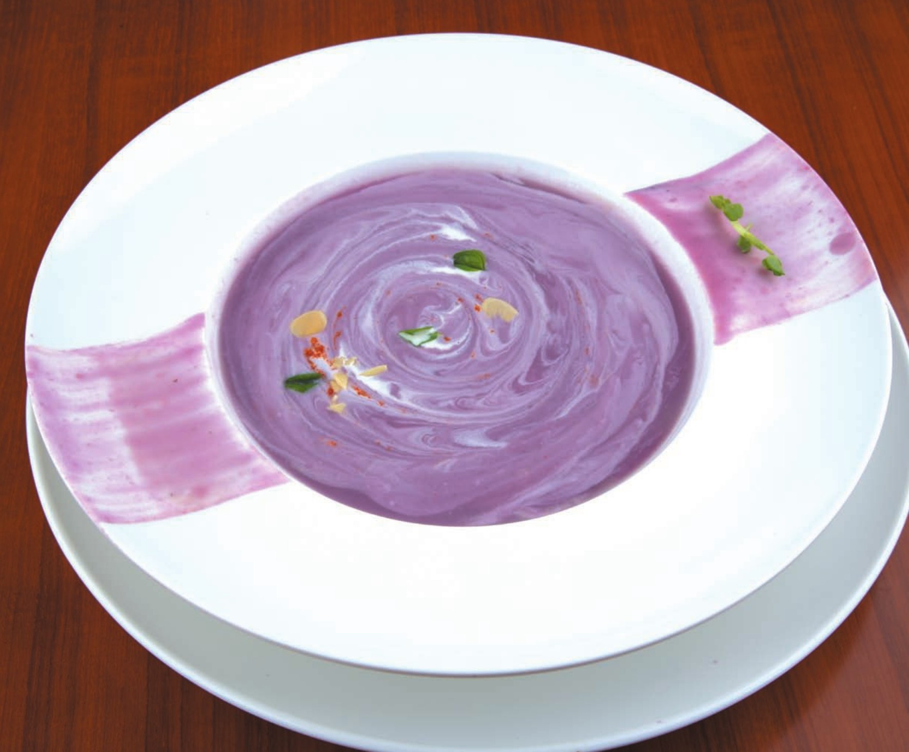 材料 紫薯300克,洋葱30克,黄油30克,蜂蜜15毫升,鸡汤底、淡奶油各适量。
