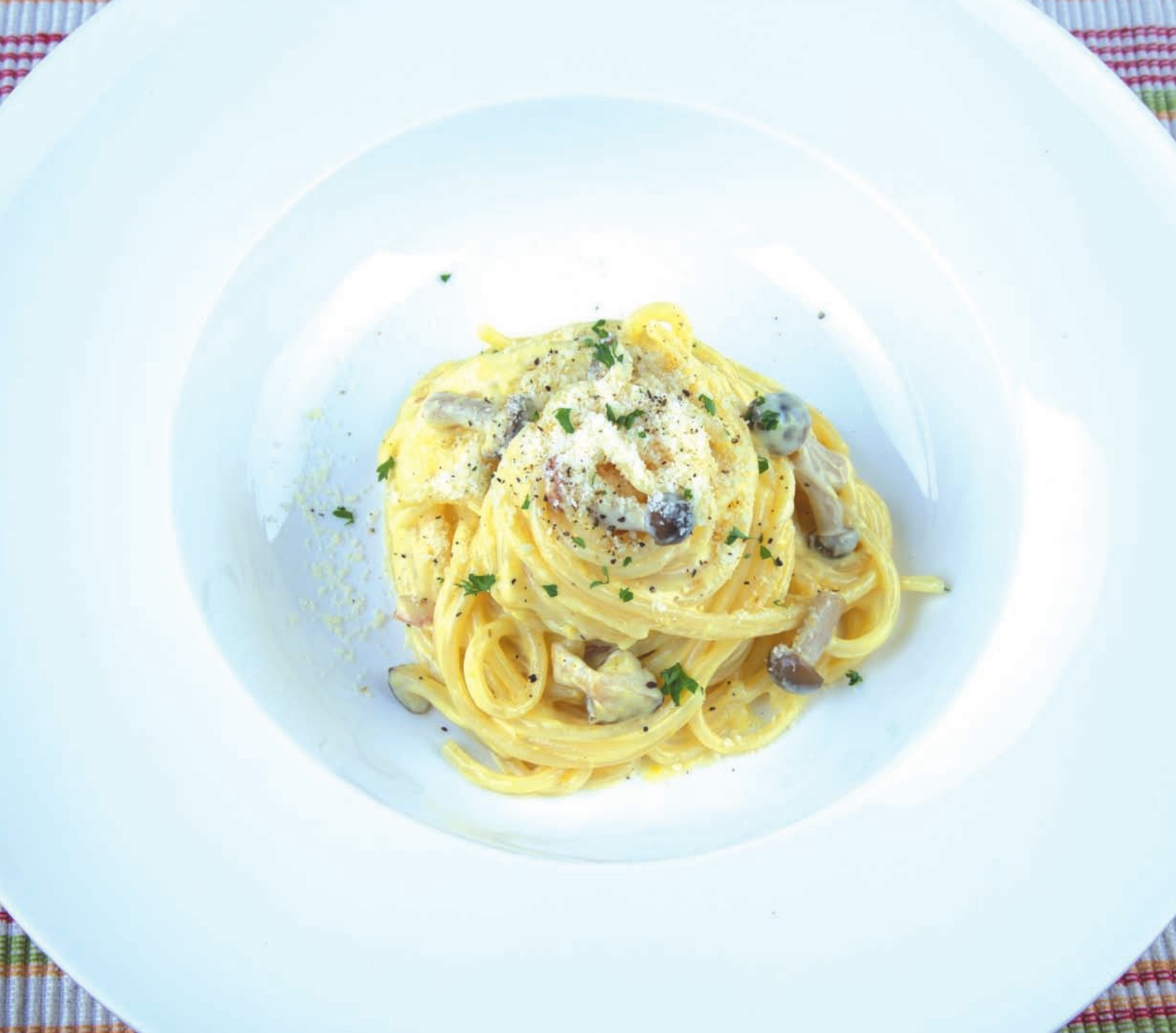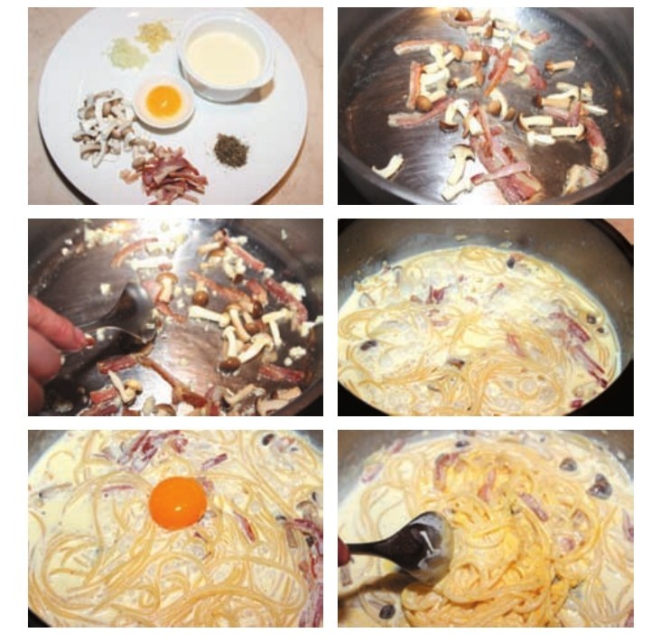 材料 意大利面150克,培根30克,洋葱10克,蒜5克,蘑菇20克,鸡蛋黄1个,淡奶油50毫升,盐、黑胡椒碎、法香碎、芝士粉各少许,白葡萄酒15毫升。