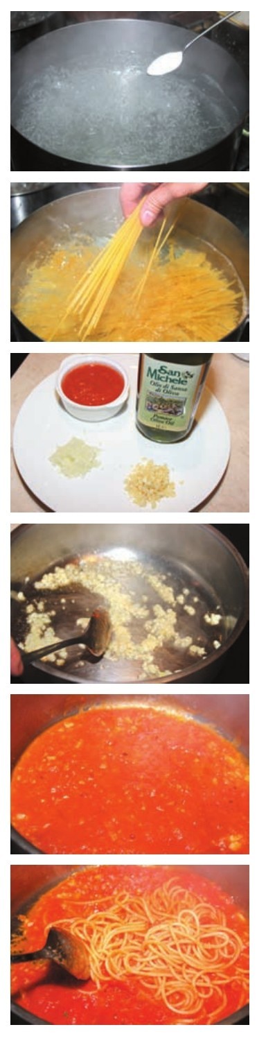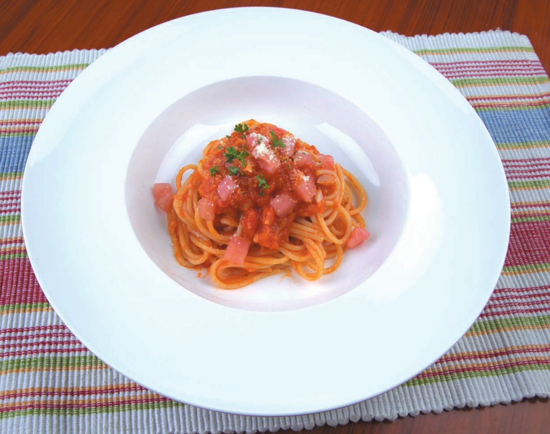 材料 意大利面150克,意式番茄酱100克,洋葱末10克,蒜末5克,橄榄油20毫升,盐、糖、法香碎各少许。