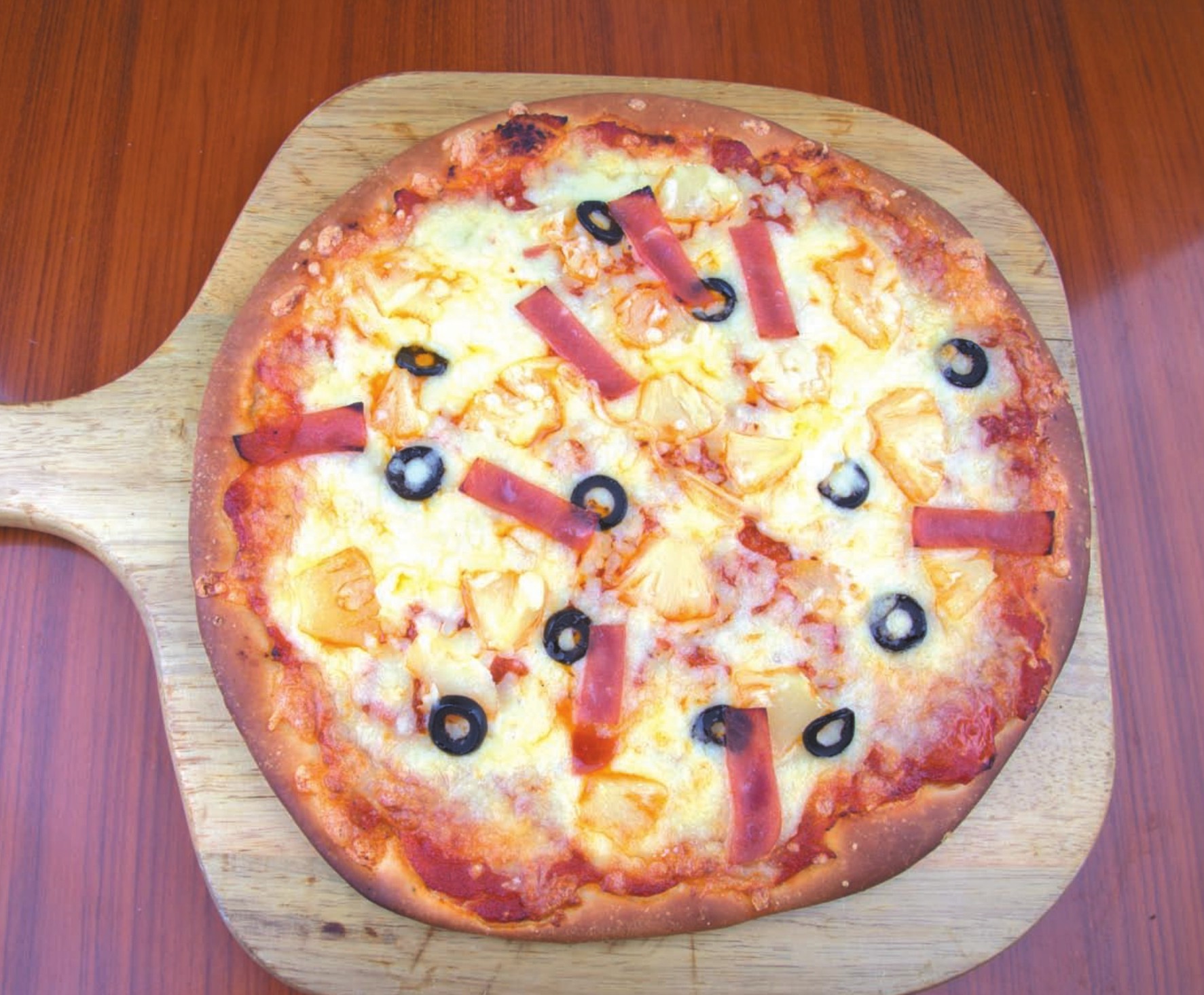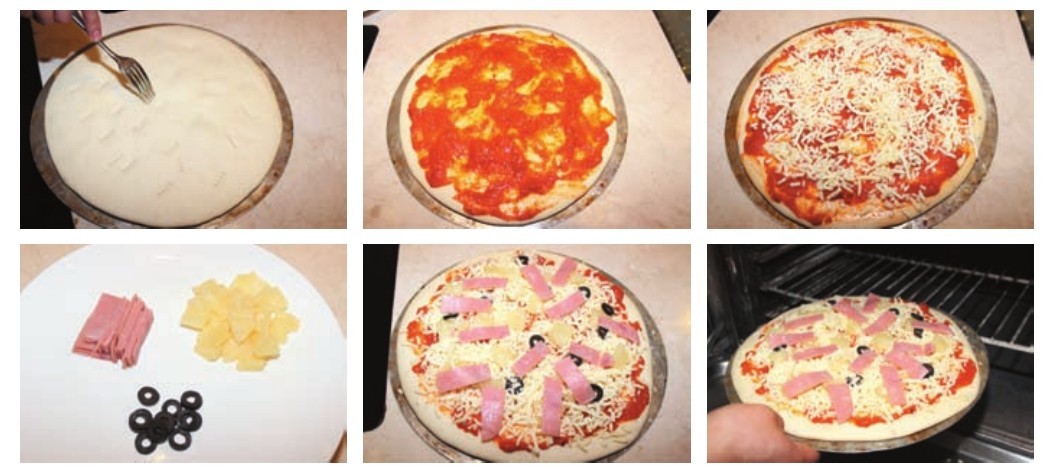 材料 比萨面团220克,火腿、菠萝各30克,橄榄5个,马苏里拉芝士90克,番茄酱50克。