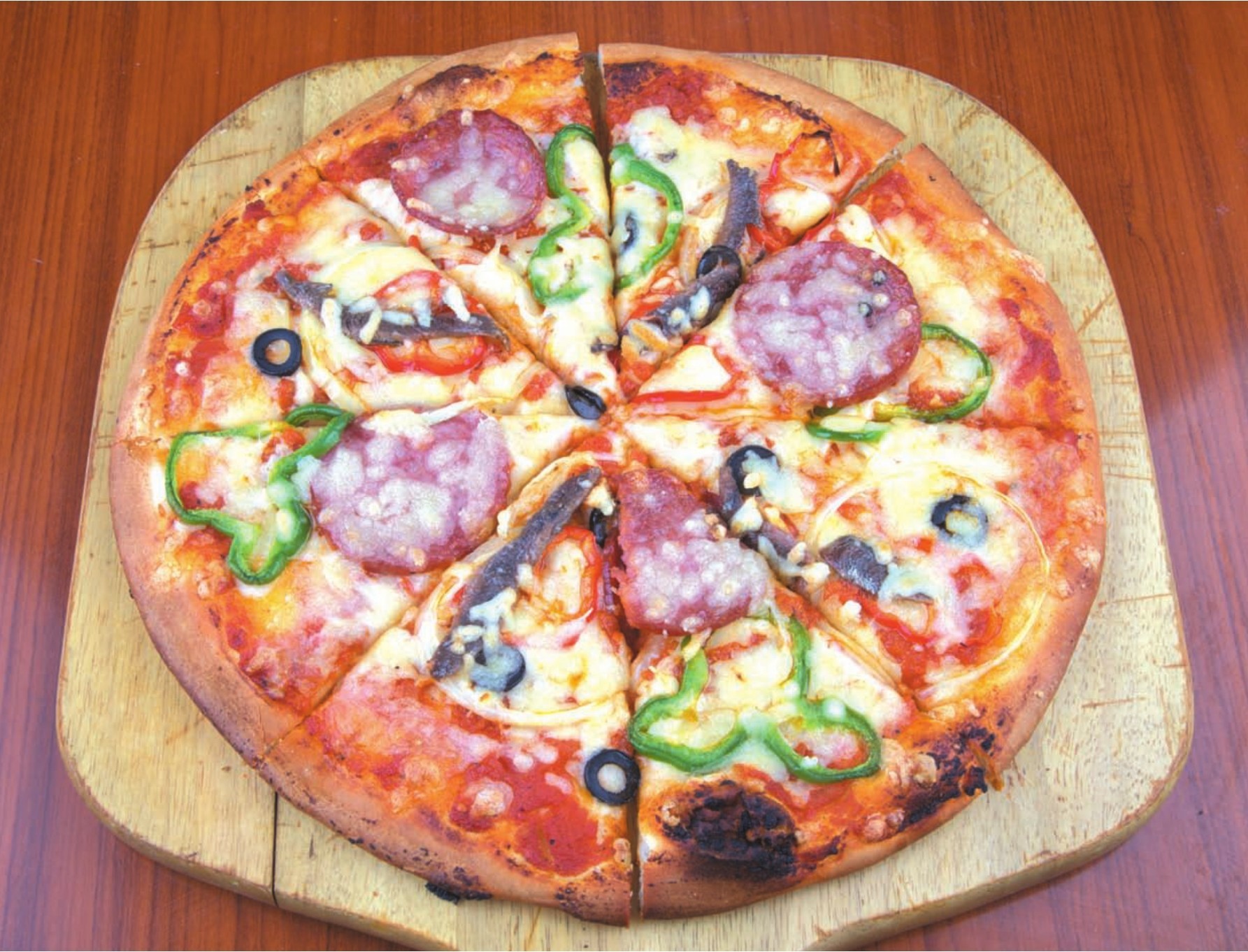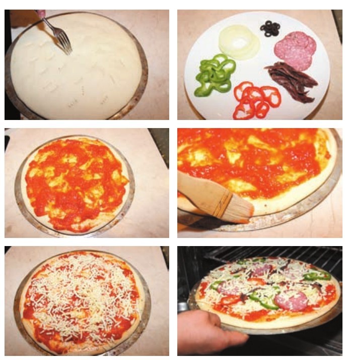 材料 比萨面团220克,意大利萨拉米香肠8片,洋葱、青椒各20克,橄榄5个,银鱼柳5只,芝士90克,番茄酱50克。