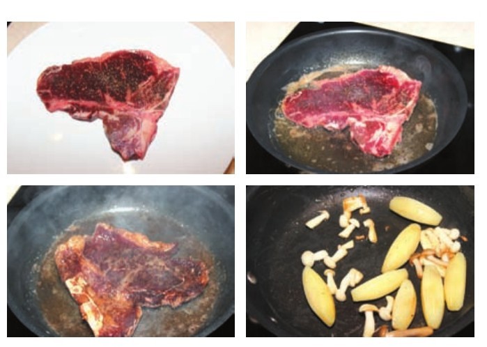 材料 小牛T骨1片,土豆片80克,小蘑菇50克,盐、黑胡椒、黑胡椒汁、植物油、黄油各适量。