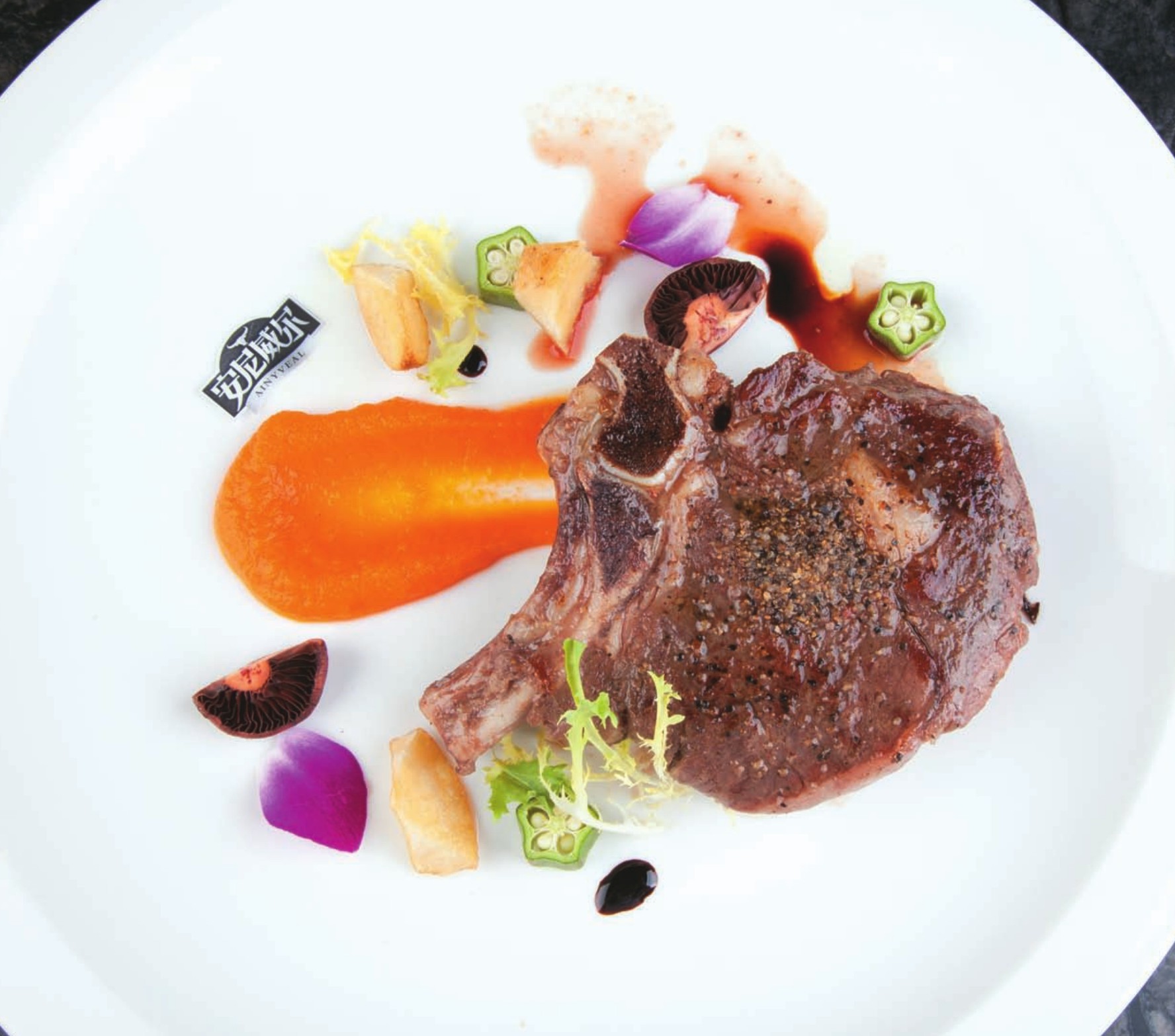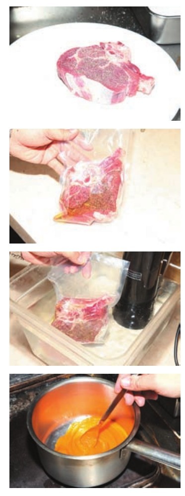 材料 小牛带骨肉眼220克,南瓜泥、土豆、蔬菜各适量,盐、黑胡椒碎各少许,橄榄油20克。