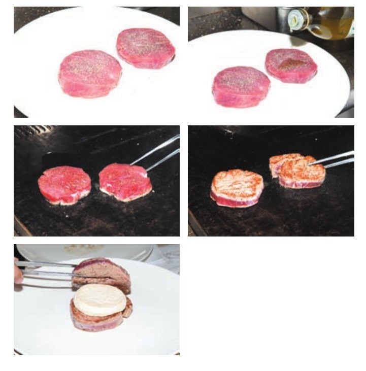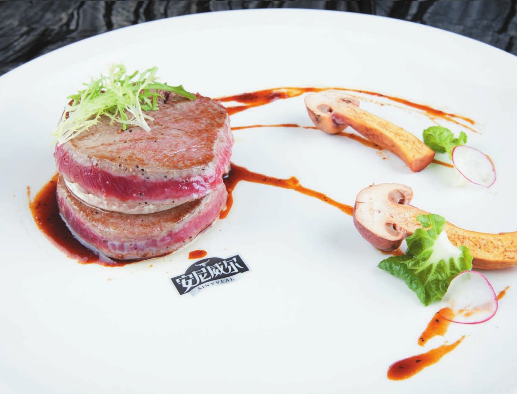 材料 小牛柳200克,芝士、野生蘑菇各少许,盐、黑胡椒碎各少许,橄榄油20克。