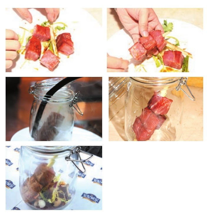 3 Place the beef string in the jar, and use the apple wood to smoke for 3 minutes.