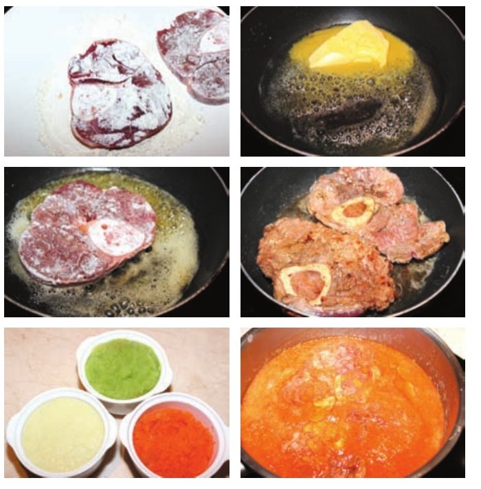 1 Cure veal shank with salt, black pepper 10 mins and put thin flour.