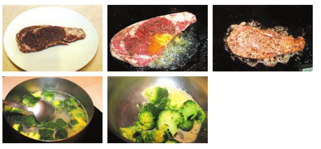 材料 肉眼牛排1个,西蓝花100克,蒜10克,盐、黑胡椒、黄油、橄榄油各少许。