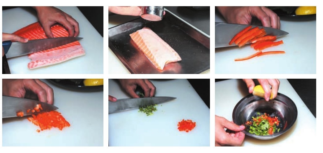材料 三文鱼腹200克,红椒30克,香菜20克,柠檬半个,盐15克。