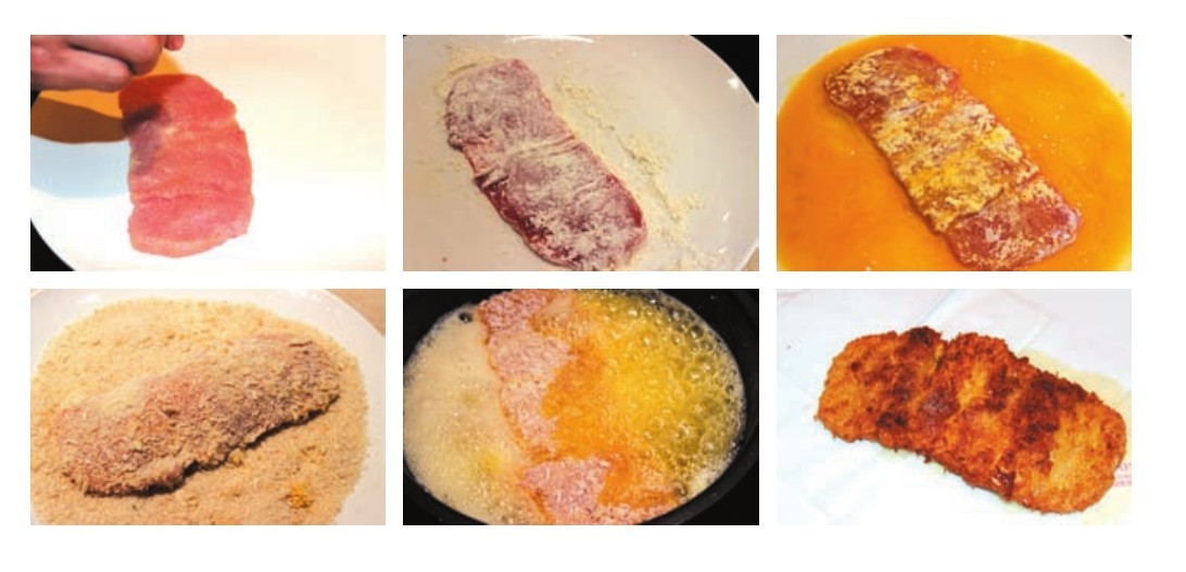2 Spread flour on marinated pig rid, stir egg liquid, and then wrap breadcrumbs.
