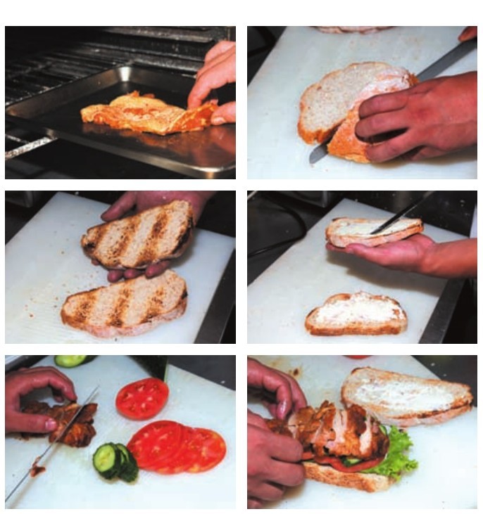 5 Put the lettuce, cucumber, tomato, piece of grade breast on the bread to make sandwich.