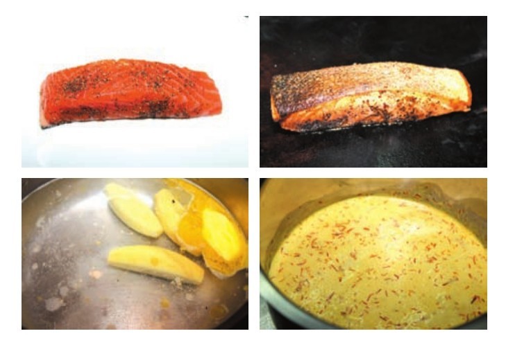 材料 三文鱼排200克,土豆块100克,藏红花1克,奶油40毫升,白葡萄酒30毫升,盐、黑胡椒、黄油各少许。