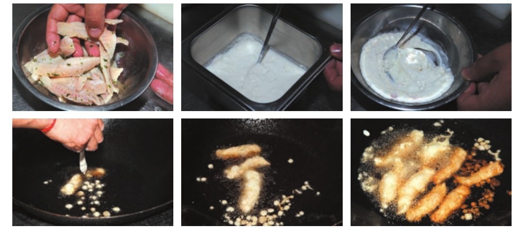 3 锅中加油烧至180℃,放入裹匀炸鱼糊的鱼柳炸至成熟。